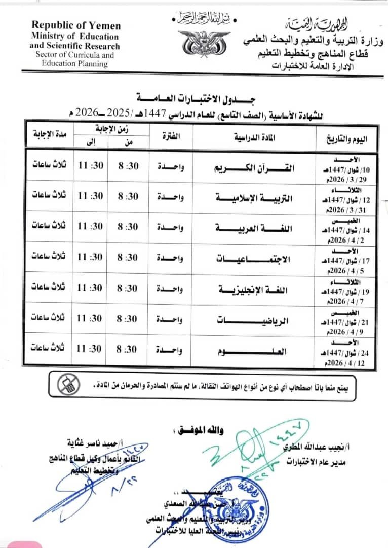 أعلنت وزارة التربية والتعليم والبحث العلمي اليمن صنعاء عن جدول الاختبارات العامة للعام الدراسي 1447هـ / 2025–2026م لطلاب الشهادة الأساسية (الصف التاسع) والشهادة الثانوية العامة – القسم العلمي.